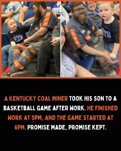 It was in that moment—the contrast of the glittering arena lights against the deep black coal dust covering Micheal’s tired face, framed by the pure, excited joy of Easton—that a fellow spectator captured a photograph. It wasn’t staged; it was simply a raw, beautiful image of a father’s devotion overriding his fatigue.