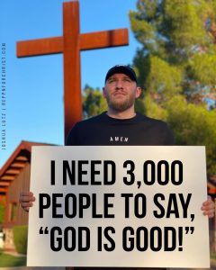 Standing beneath the soaring shadow of a large wooden cross—a quiet testament to sacrifice and hope—is Joshua Lutz. His expression is serious, not pleading, but resolute, holding aloft a simple, handwritten sign that cuts through the digital chaos. The sign reads: “I NEED 3,000 PEOPLE TO SAY, ‘GOD IS GOOD!'”