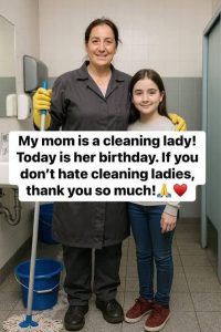 The emotional core of the image lies in the overlaid text, written in Sofia’s own voice: “My mom is a cleaning lady! Today is her birthday.”