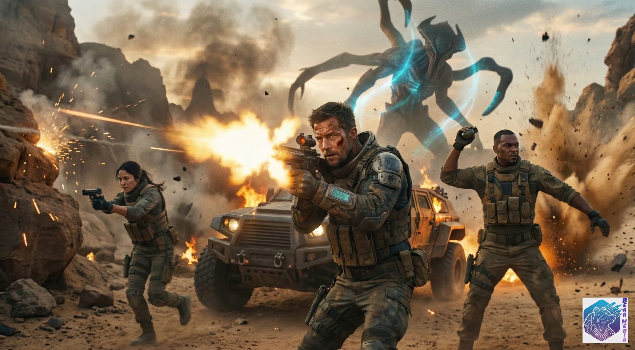 Get ready for an adrenaline injection! This explosive new trailer thrusts us onto a hostile, sun-baked alien world where survival is a luxury. Led by a battle-hardened commander, an elite squad faces impossible odds against colossal, shadowy alien behemoths towering over the battlefield.
